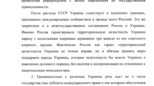 При этом в документе отмечается, что в связи в последними событиями органы государственной власти Украины оказались в параличе, в результате чего "лишенные государственной защиты в своей стране, регионы Украины, большую часть населения которых составляют русскоязычные граждане, ищут способы отстоять свою самостоятельность, самобытность, обращаясь в первую очередь к России".
