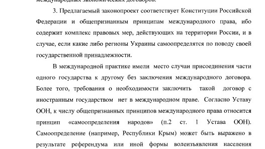 Напротив, навязывание такому самоопределяющемуся населению требования договорного согласия всего государства (Украины) с самоопределением населения конкретного региона (Крыма) противоречило бы названному международно-правовому принципу самоопределения народов, отмечают депутаты.