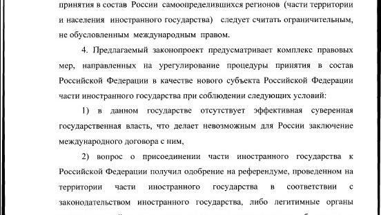 Следует отметить, что законопроект предусматривает лишь присоединение к России новых территорий, но не выход субъектов Федерации из ее состава.