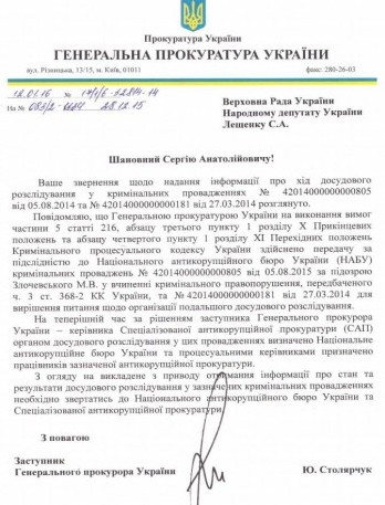"Генеральной прокуратурой Украины … осуществлена передача по подследственности в Национальное антикоррупционное бюро Украины (НАБУ) уголовных производств от 05.08.2015 по подозрению Злочевского М.В. в совершении уголовного преступления, предусмотренного ч.3 ст.368-2 (незаконное обогащение - НБН) УК Украины, и от 27.03.2014 для решения вопроса по организации дальнейшего предварительного расследования ", - говорится в ответе Генпрокуратуры на запрос народного депутата от "Блока Петра Порошенко" Сергея Лещенко.
