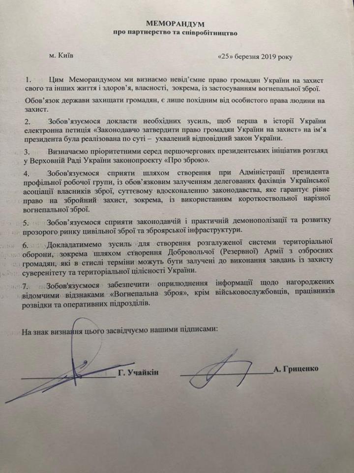 Лидер партии "Гражданская позиция" и кандидат в президенты Анатолий Гриценко подписал меморандум с Украинской ассоциацией владельцев оружия в котором пообещал приложить все усилия для легализации права на владение огнестрельным оружием в Украине.