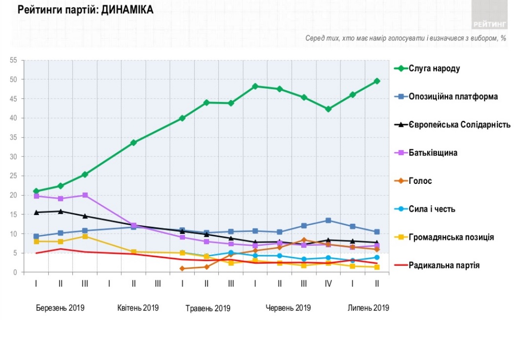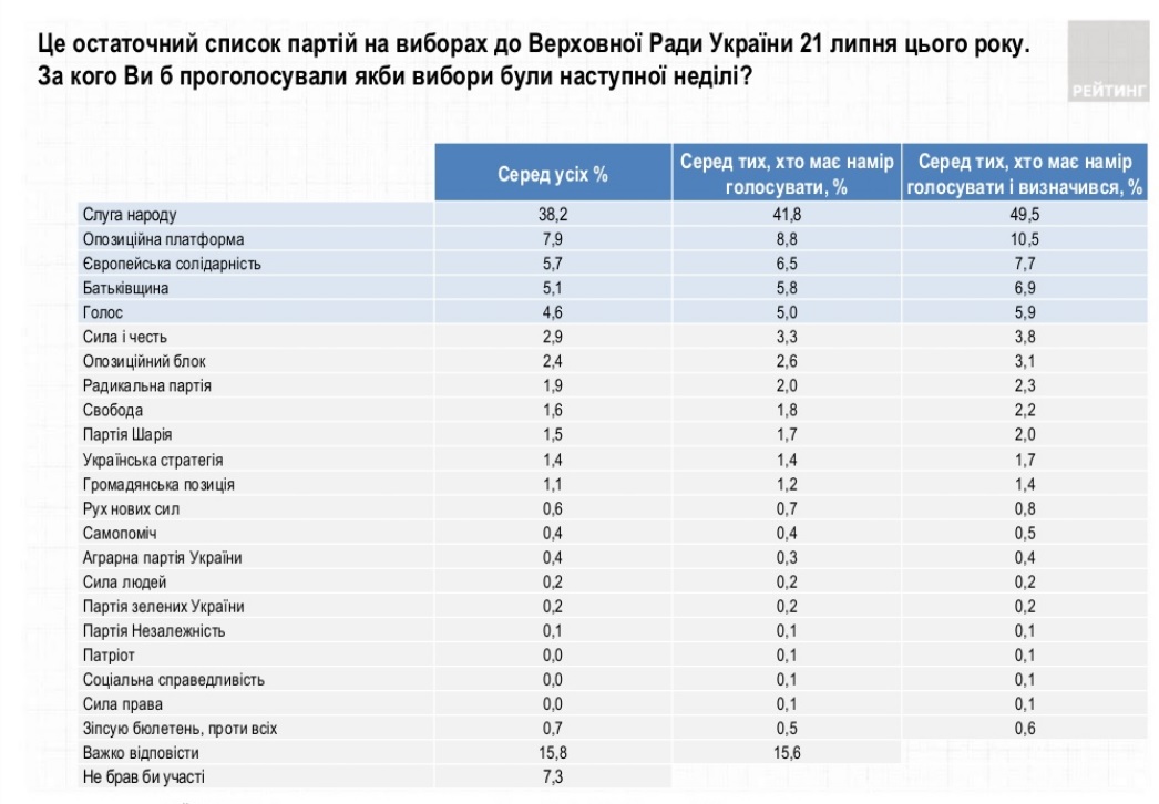 Согласно опросу, лидером электоральных симпатий среди политических сил является партия президента Зеленского "Слуга народа", которую готовы поддержать 49,5% тех, кто намерен голосовать и определился с симпатиями. Также преодолевают 5%-й проходной барьер партия "Оппозиционная платформа – За жизнь", которую поддерживают 10,5% определишься, партия "Европейская солидарность" 7,7%, ВО "Батькивщина" 6,9% и партии "Голос" 5,9%.