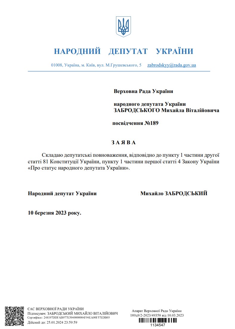 Народный депутат из фракции «Европейская солидарность» генерал-лейтенант Михаил Забродский написал заявление о сложении депутатских полномочий. Соответствующий проект постановления №9114 зарегистрирован в парламенте 17 марта.