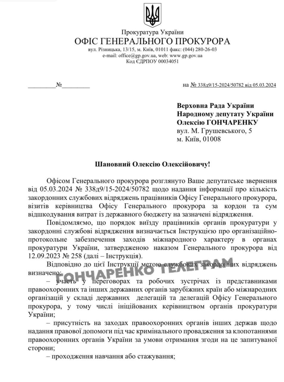 Сегодня депутат от партии "Евросолидарность" Алексей Гончаренко подтвердил месседж о частом отсутствии генпрокурора. На своем Tg-канале он опубликовал ответ его офиса на запрос, в котором интересовался, в скольких заграничных командировках успел побывать Костин.