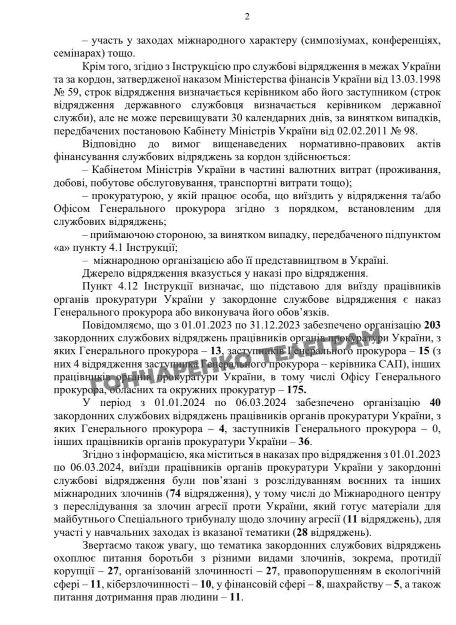 По данным ОГП, в 2023-м поездок за границу у генпрокурора было 13, а в течение трех месяцев 2024-го — четыре. То есть он бывает за пределами Украины чаще раза в месяц.