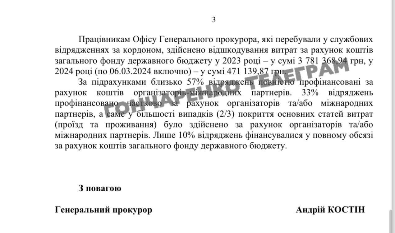 "Около 75% командировок полностью профинансированы за счет средств организаторов-международных партнеров. 33% командировок профинансированы частично за счет организаторов и/или международных партнеров... — сказано в ответе ОГП. — Только 10% командировок финансировались в полном объеме за счет средств общего государственного фонда".