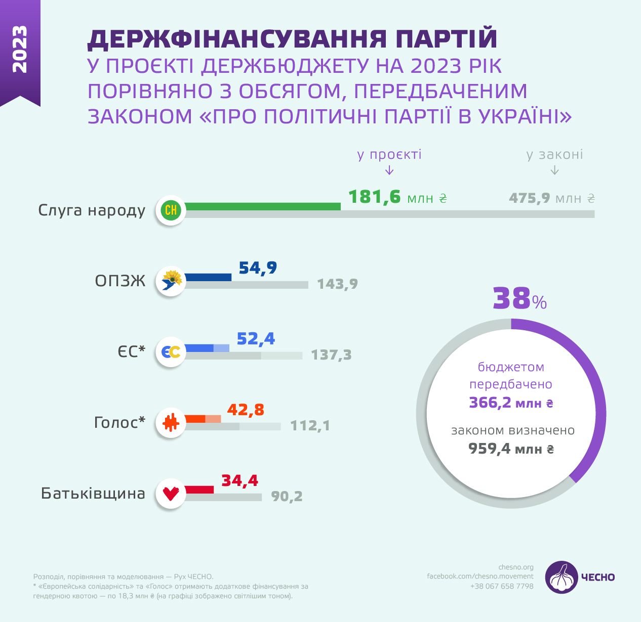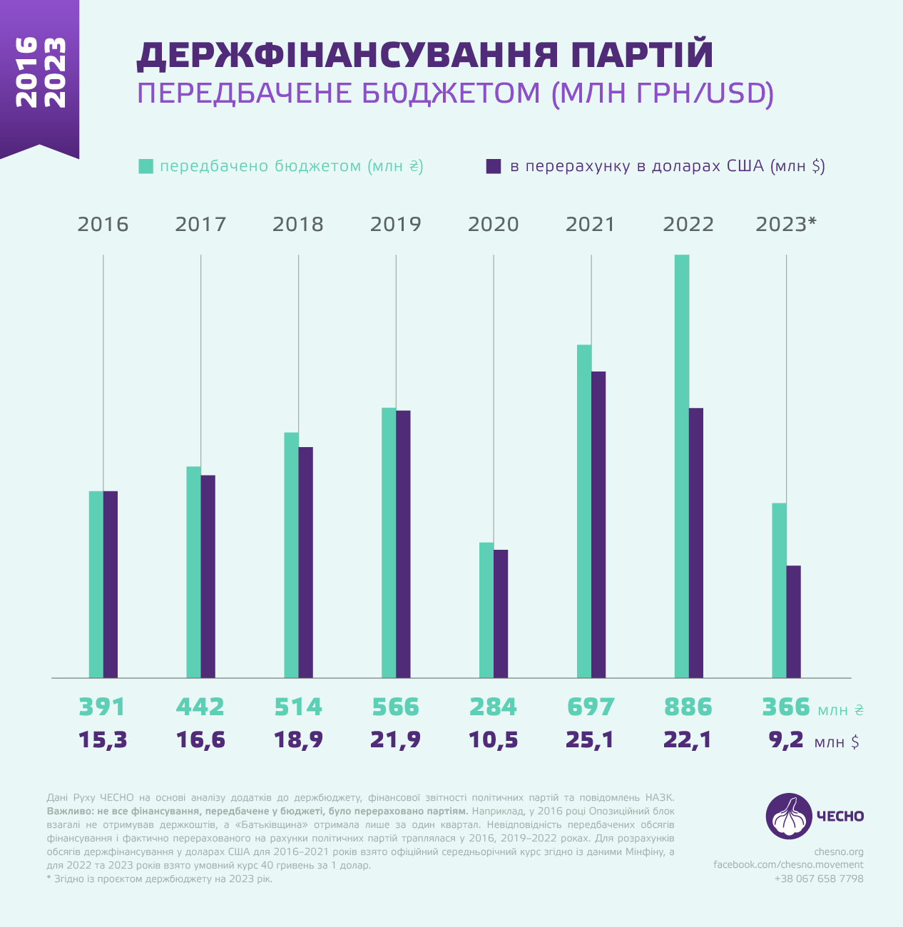 Согласно плану государственного бюджета на 2023 год, политические парламентские партии могут получить 366,2 миллиона гривень. Как отмечают в ОО «Рух Чесно», если эта статья расходов будет утверждена без изменений, расходы на партийную поддержку станут одними из самых низких с 2016 года, когда было введено госфинансирование.