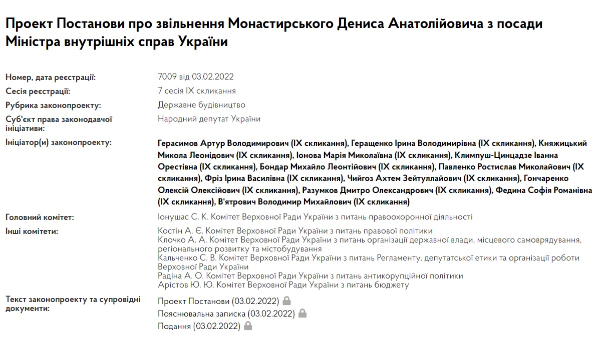 В Верховной Раде в четверг, 3 февраля, зарегистрирован проект постановления № 7009 об увольнении с должности министра внутренних дел Дениса Монастырского.