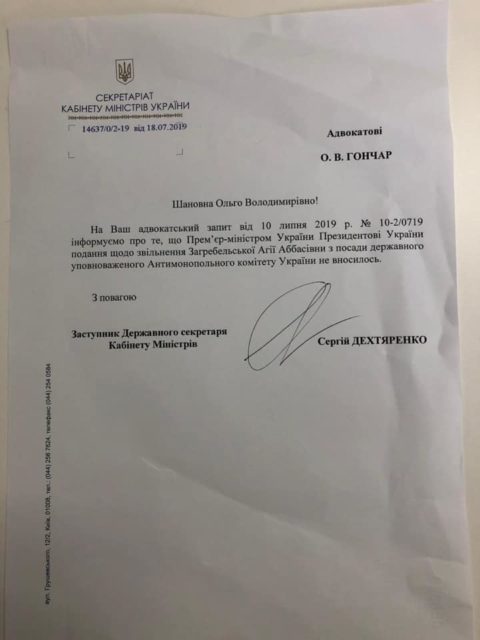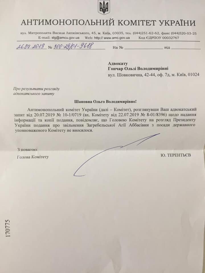 Председатель Антимонопольного комитета Юрий Терентьев сообщил, что он не делал представление на увольнение держуповноваженої Агии Загребельской. Об этом сама же Загребельская сообщила на своей странице в Facebook, опубликовав ответ АМКУ от 27 июля за подписью Юрия Терентьева на адвокатский запрос.