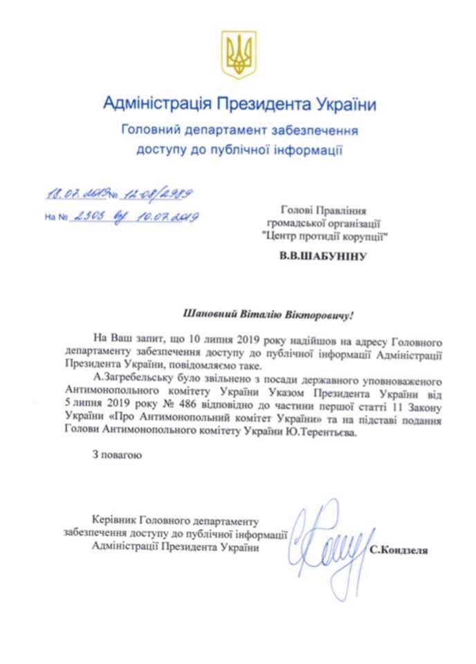 В документе сообщается, что председателем Комитета не вносилось представление об увольнении Загребельского на рассмотрение президенту. Однако это прямо противоречит официальному ответу Офиса президента от 18 июля на запрос "Центра противодействия коррупции". Тогда у президента заявили, что Загребельскую уволили на основании представления председателя АМКУ Юрия Терентьева.