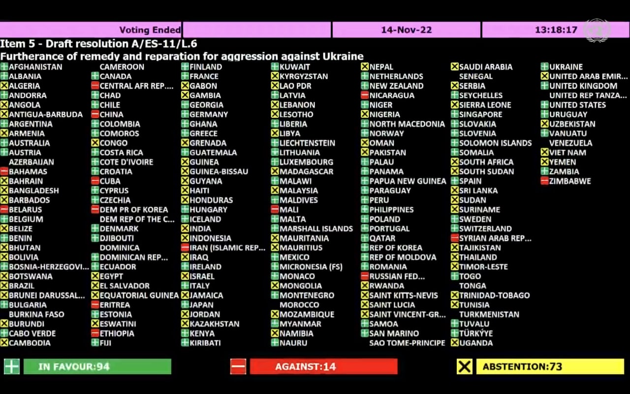 Генеральная Ассамблея Организации Объединенных Наций в понедельник, 14 ноября, официально признала необходимость привлечения России к ответственности за войну против Украины и выплат ею репараций нашему государству. Однако далеко не все страны проголосовали "за" принятие соответствующей резолюции.