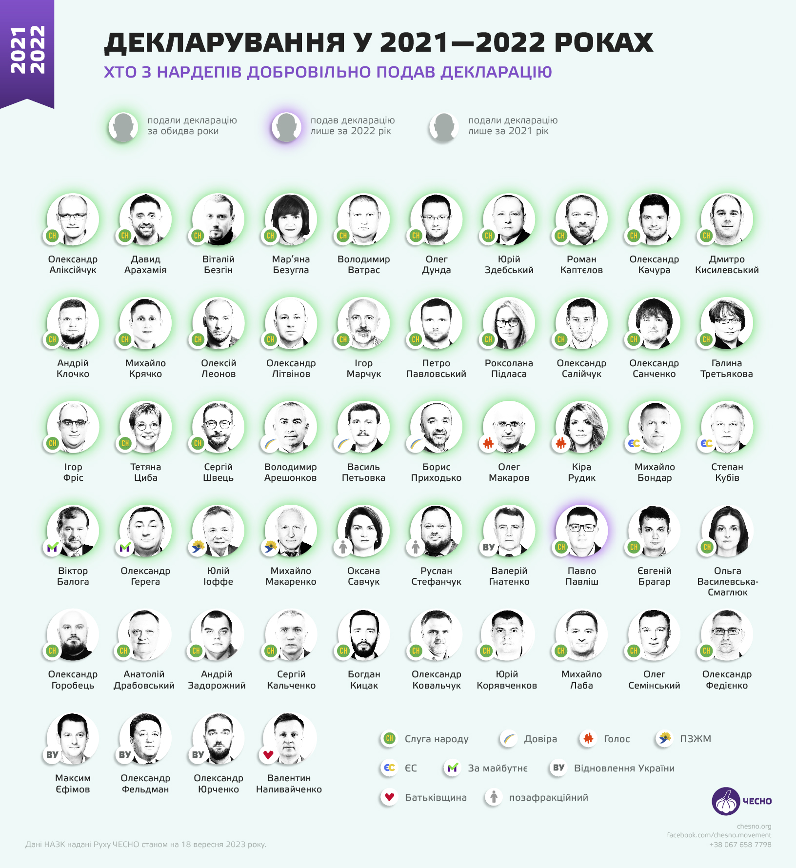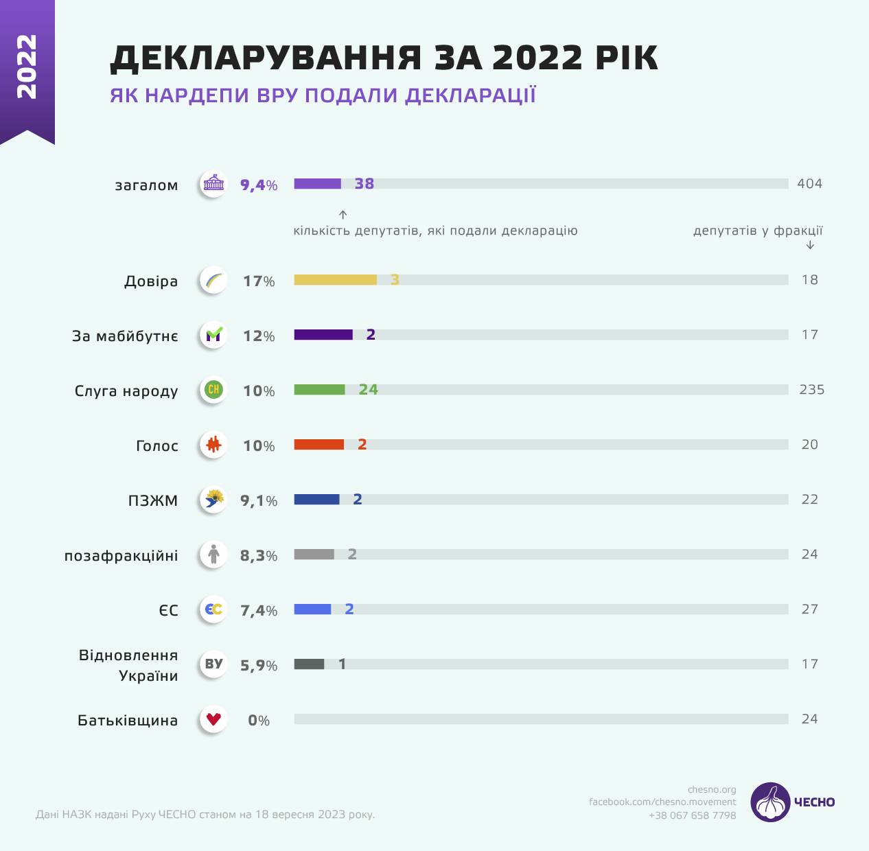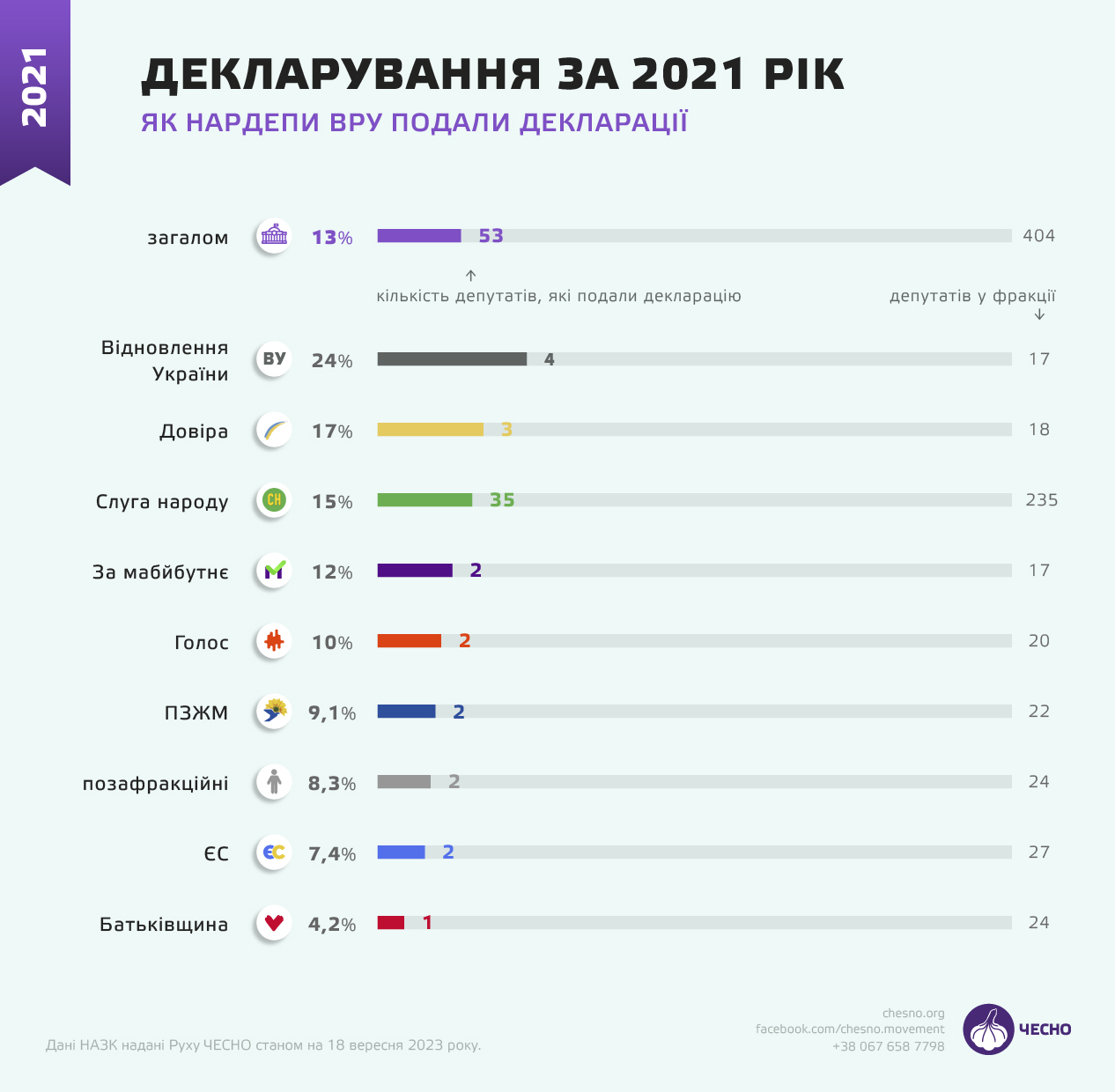Движение ЧЕСНО получило от Национального агентства по предотвращению коррупции данные, что только 53 депутата Верховной Рады Украины добровольно подали имущественные декларации за 2021 год, за 2022 год - только 38 депутатов.
