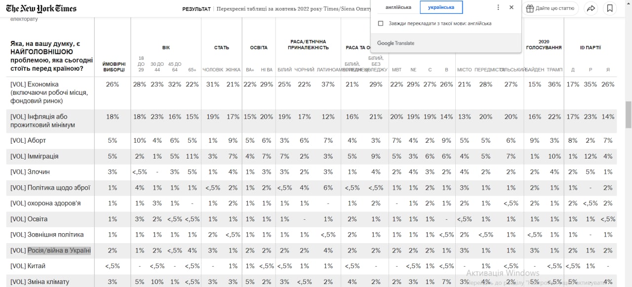 Опрос New York Times/Siena College собрал ответы 792 зарегистрированных избирателей по всей стране, проводился с помощью сотовых и стационарных телефонов с 9 по 12 октября 2022 года.