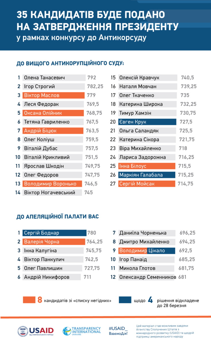 6 марта Высшая квалификационная комиссия судей объявила 39 победителей конкурса среди кандидатов в ВАКСУ, среди которых 22 судьи, 13 адвокатов и четверо ученых-правоведов. 12 из них рекомендованы к назначению в Апелляционную палату ВАКСУ.