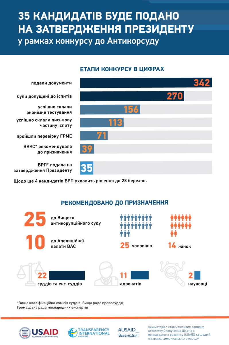 Документы на участие в конкурсе подали 342 человека. К экзаменам были допущены 270, успешно сдали их 113 кандидатов в судьи. После интервью с международными экспертами остался 71 претендент.