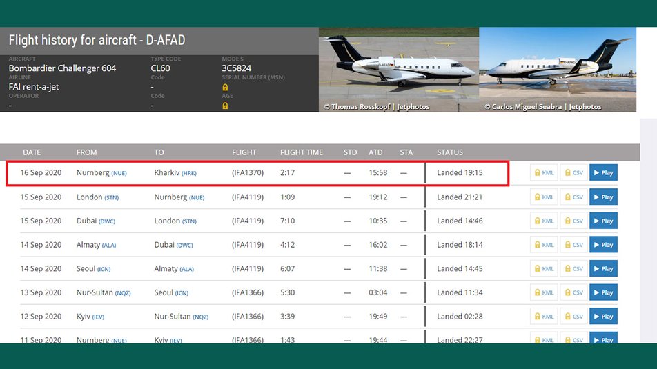 Как отмечает «Суспільне», самолет Bombardier Challenger 604 с бортовым номером D-AFAD, который принадлежит компании FAI Aviation Group, перевозил в Германию отравленного «Новичком» российского политика Алексея Навального.