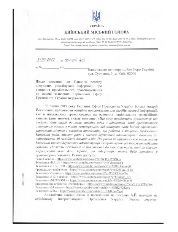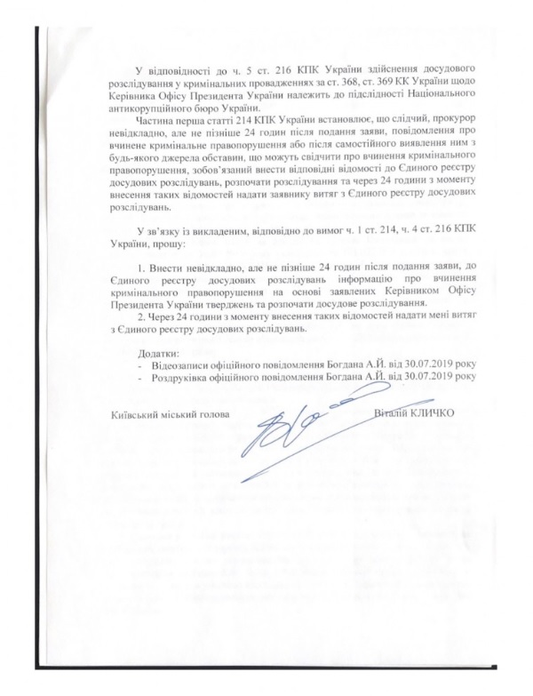 Мэр Киева и пока еще глава Киевской городской государственной администрации Виталий Кличко просит Национальное антикоррупционное бюро открыть уголовное производство и проверить заявления главы Офиса президента Украины Андрея Богдана о том, что ему предлагали $ 20 миллионов взятки за то, чтобы действующий мэр остался на посту.