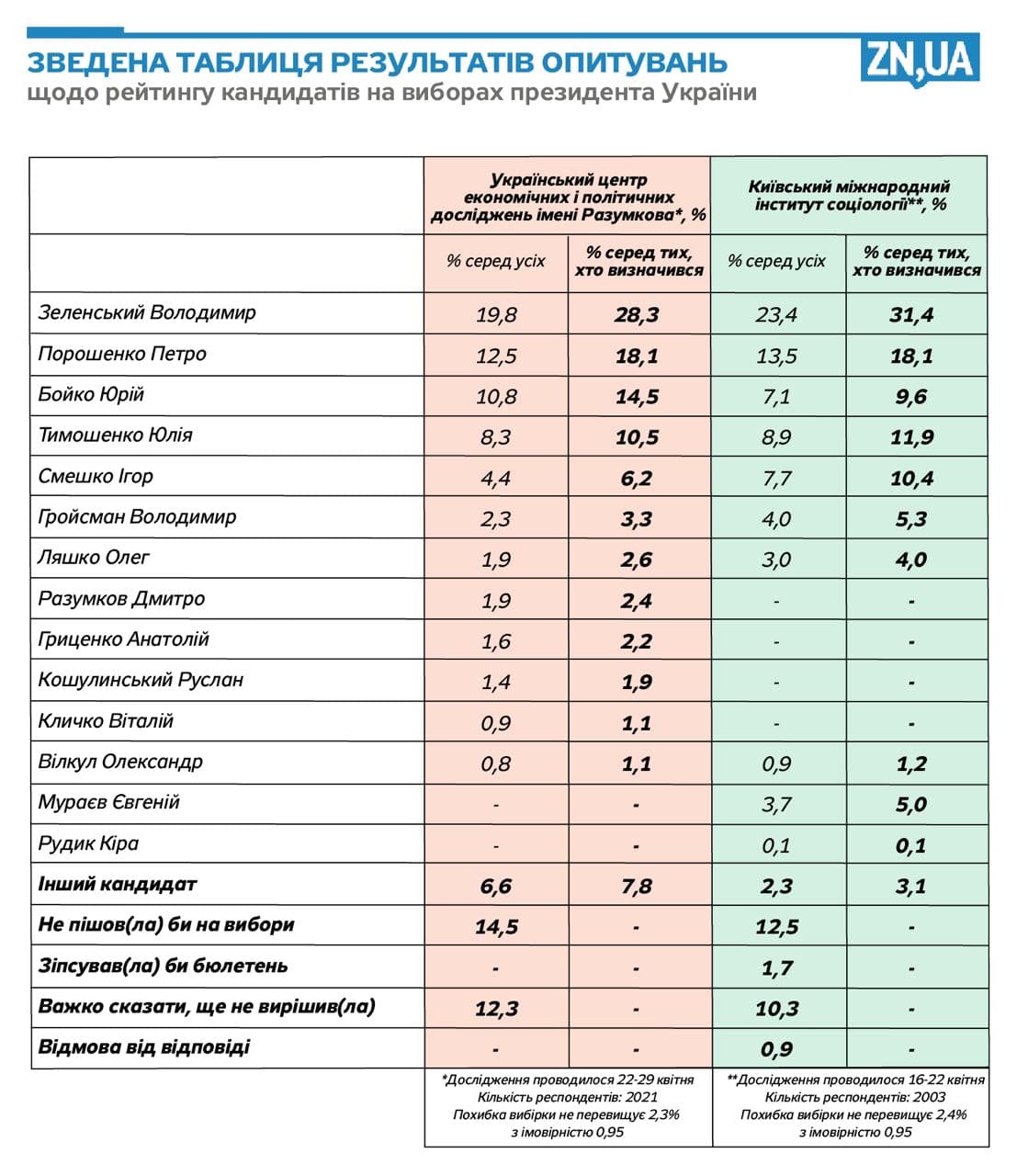 Как отмечают в Центре Разумкова, за Владимира Зеленского готовы отдать свои голоса 28,3% респондентов, определившихся с кандидатурой (или 19,8% от всех). Для сравнения, по данным КМИС, за Зеленского проголосовали бы 31,4% определившихся опрошенных (или 23,4% от всех). Разница между полученными данными превышает погрешность выборки.