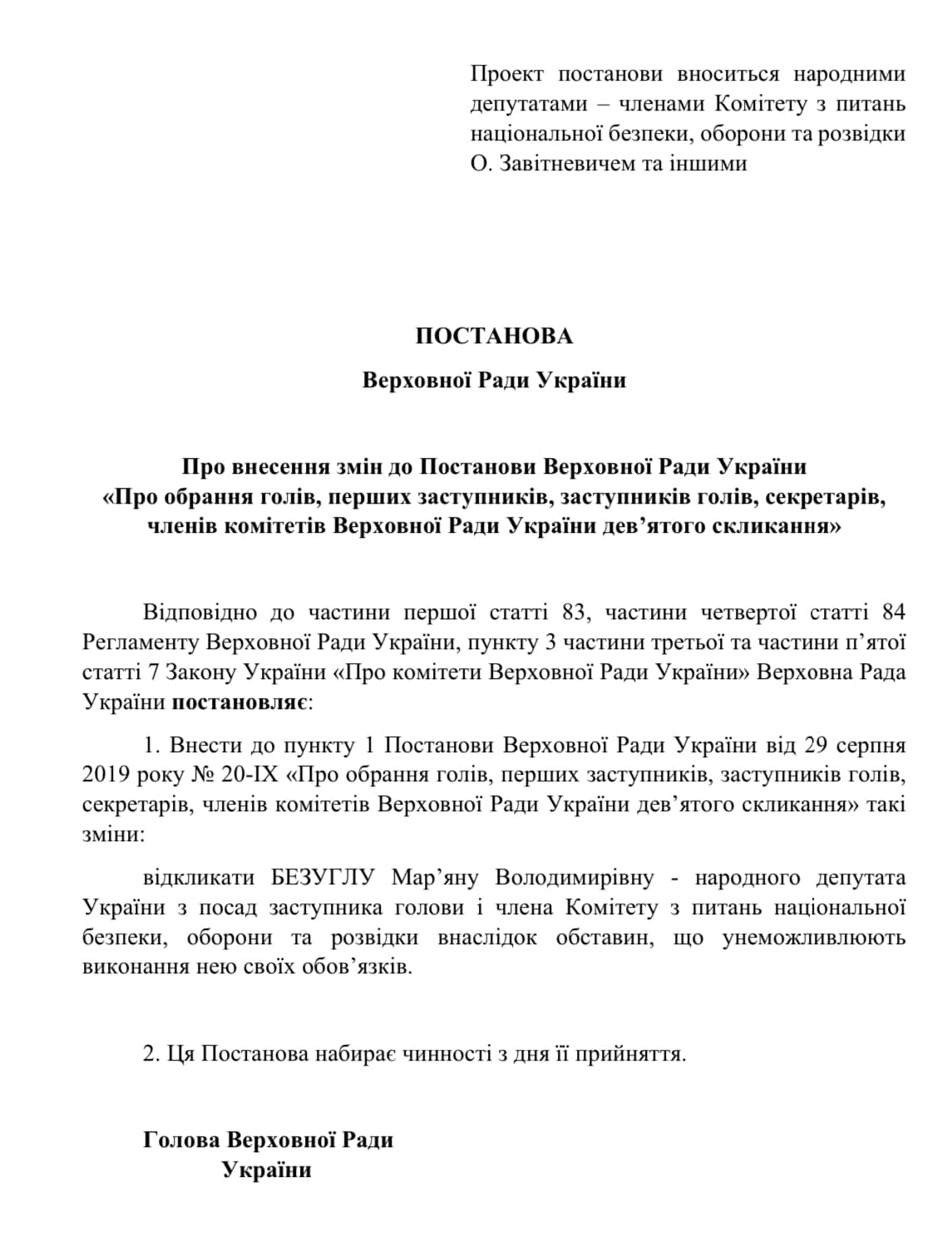 «Комитет нацбезопасности, обороны и разведки Верховная Рада Украины во второй раз приняла решение об отзыве Марианны Безуглой с должности заместителя Председателя Комитета и члена Комитета. Это решение требует рассмотрения парламента, которое должно быть включено в повестку дня для одобрения народными депутатами», - написала она.
