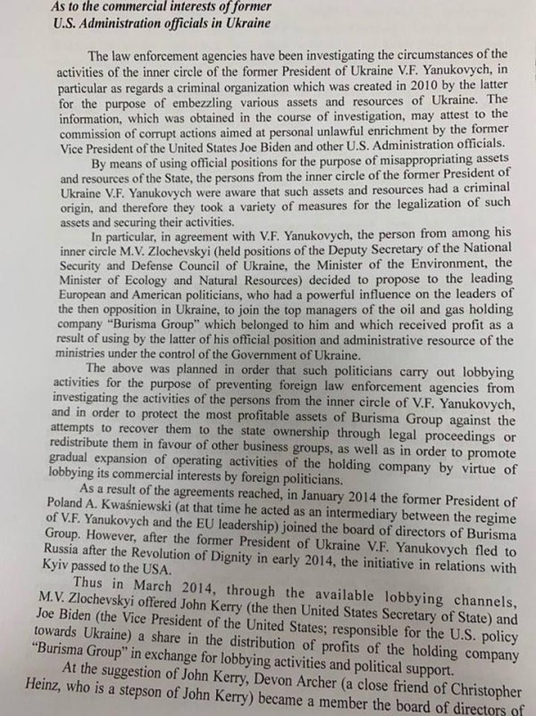 Согласно данным в записке, как сообщает Лещенко, в марте 2014 года через лоббистские каналы экс-министр экологии Николай Злочевский якобы предложил госсекретарю США Джону Керри и вице-президенту Джо Байдену распределить прибыли в компании "Буризма". Деньги якобы платили сыну Байдена и близкому другу приемного сына Керри Дэвону Арчеру.