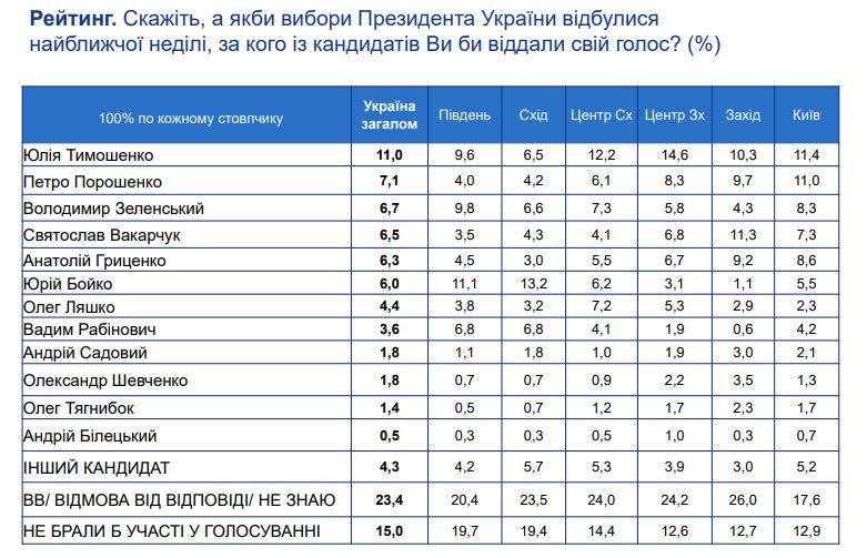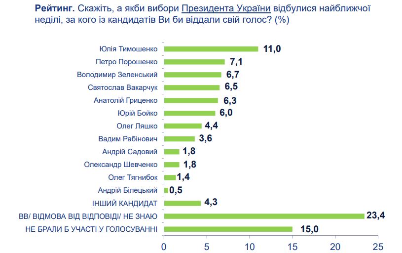 На третьем месте оказался шоумен и комик Владимир Зеленский с 6,7% поддержки, на четвертом лидер группы "Океан Эльзы" Святослав Вакарчук с 6,5%, а на пятой позиции лидер партии "Гражданская позиция" Анатолий Гриценко с 6,3%. За ними следуют Юрий Бойко (6,0% ), Олег Ляшко (4,4%) и Вадим Рабинович (3,6%).