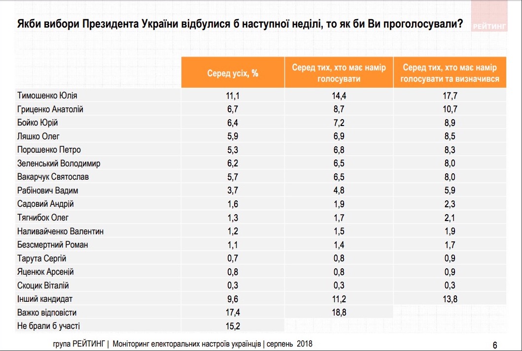 Так, Тимошенко имеет прочные электоральные позиции практически во всех макрорегионах, с относительно высокими показателями на Западе, в Центре и на Юге. Основная электоральная база Гриценко сегодня также больше сосредоточена в западных и центральных регионах. Порошенко поддерживают более-менее равномерно во всех макрорегионах за исключением Востока. Ляшко – на Юге и в Центре, Вакарчука – на Западе. Избирателей Бойко, Рабиновича и Зеленского относительно больше на Востоке и Юге, с той разницей, что Бойко и Рабиновича относительно больше поддерживают на Востоке, а Зеленского – на Юге.