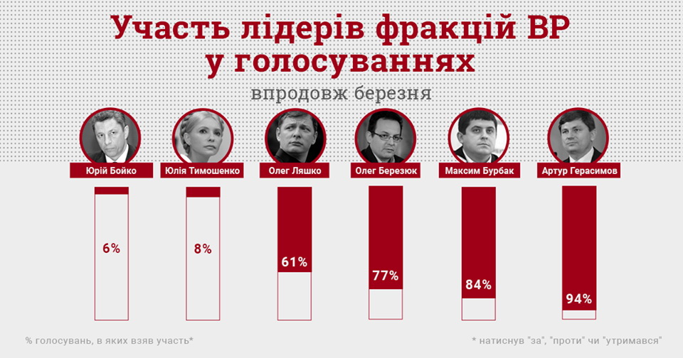 Председатель фракции "Самопомич" Олег Березюк проголосовал в 77% случаев, Максим Бурбак из "Народного фронта" – 84%, Артур Герасимов из БПП – 94%.