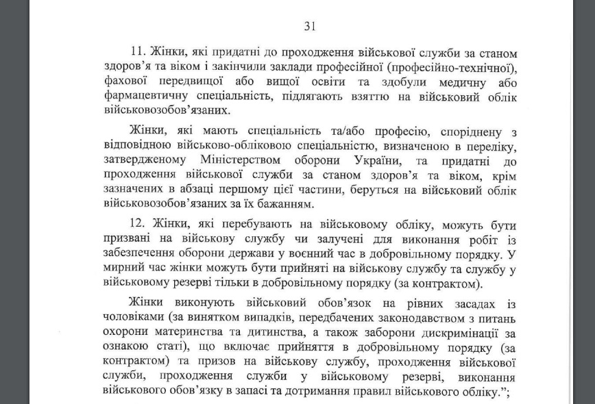 Согласно новому проекту о мобилизации, текст которого обнародовали на сайте правительства 30 января, взятию на военный учет военнообязанных подлежат женщины, пригодные к прохождению военной службы по возрасту и состоянию здоровья и окончившие учреждения профессионально-технического, профессионального высшего или высшего образования и получили медицинскую или фармацевтическую специальность.