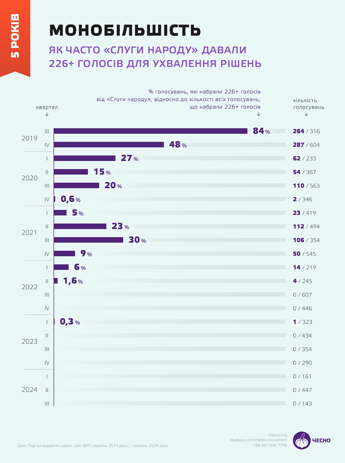 В то же время, несмотря на номинальное существование монобольшинства, только в 14% «слуги» смогли принять те или иные решения только голосами своей партии. Правда, в цифровом измерении это не так уж мало 1089 из почти 8000 проголосованных инициатив.
