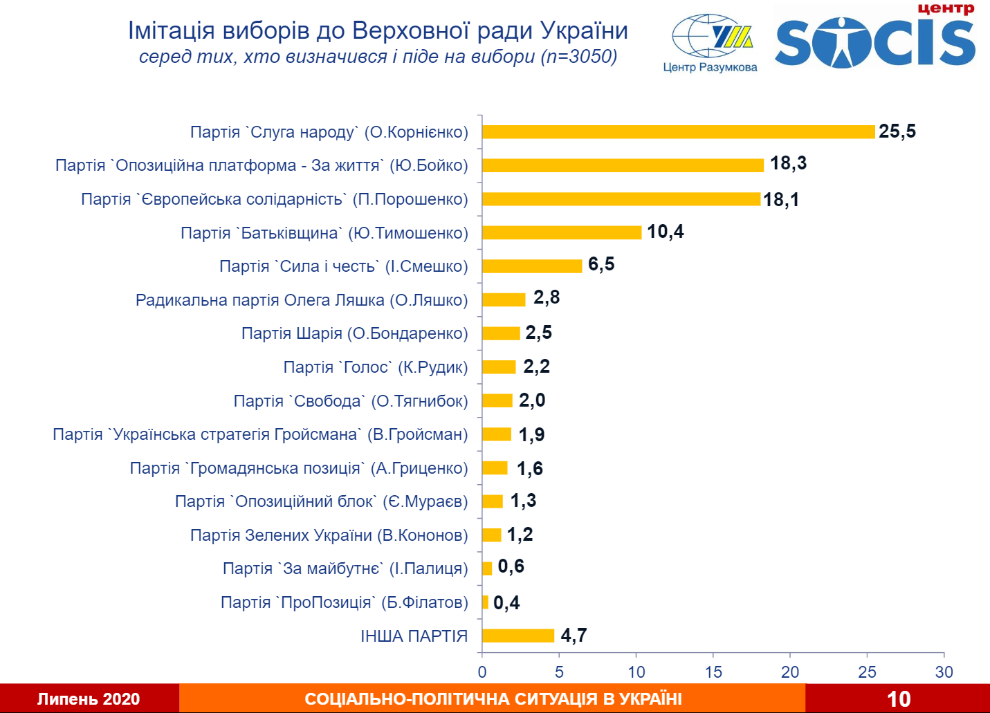 Так, партия “Слуга народа” получила бы 25,5% голосов, а “Оппозиционная платформа - За жизнь” 18,3%. При этом за “Европейскую солидарность” готовы проголосовать 18,1% граждан, за “Батькивщину” - 10,4%, за “Силу и честь” - 6,5%.
