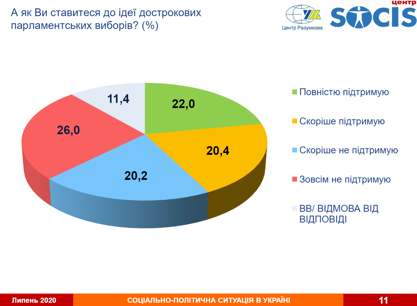 При этом 22% граждан полностью поддерживают идею досрочных выборов в Верховную Раду, 20,4% - скорее поддерживают. Еще 20,2% украинцев скорее не поддерживают проведение досрочных выборов, 26% - совершенно не поддерживают.