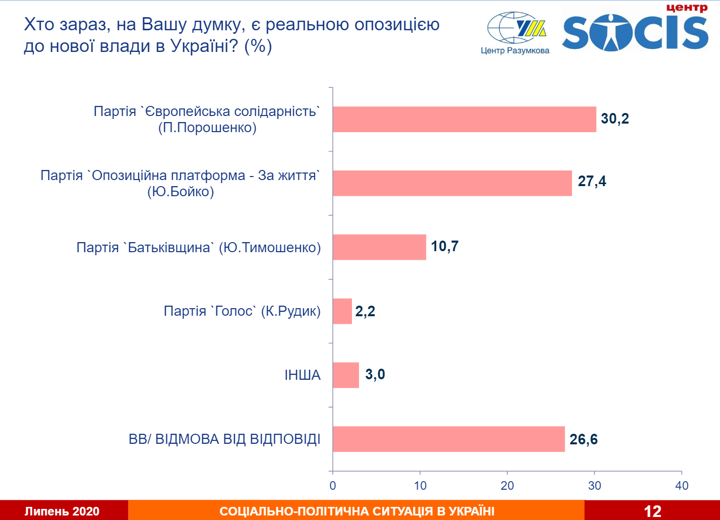 Кроме того, 30,2% украинцев считают партию “Евросолидарность” той политической силой, которая является реальной оппозицией в Украине. Для 27,4% - это ОПЗЖ, для 10,7% - “Батькивщина”, для 2,2% - “Голос”. Еще 3% опрошенных назвали другие партии.