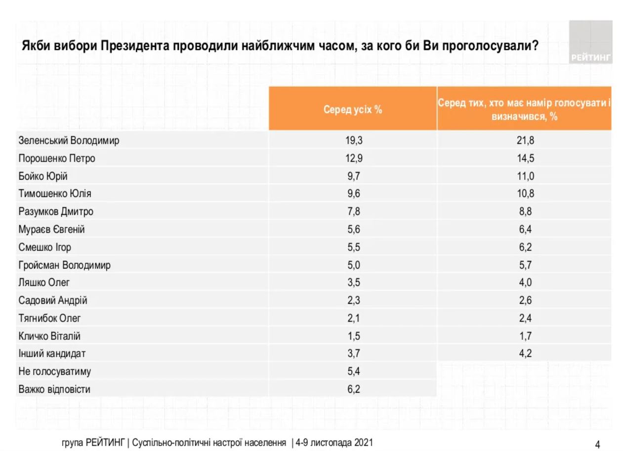 Если бы выборы президента Украины проходили в ближайшее время, то за действующего главу государства Владимира Зеленского проголосовали бы 21,8% украинцев, которые уже определились и приняли бы участие в волеизъявлении, говорится в результатах опроса Социологической группы «Рейтинг». За пятого президента Петра Порошенко проголосовали бы 14,5% определившихся. Отметим, что разрыв между действующим и бывшим президентами сократился за счет понижения рейтинга Зеленского.