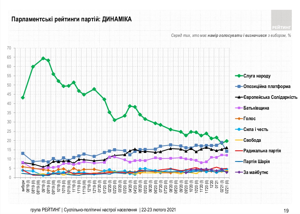Если бы выборы в Верховную Раду проходили в ближайшее время, то партия "Слуга народа" могла бы получить 19,7% голосов, которые уже определились и пойдут голосовать. Об этом говорится в опросе, проведенном Социологической группой "Рейтинг".
