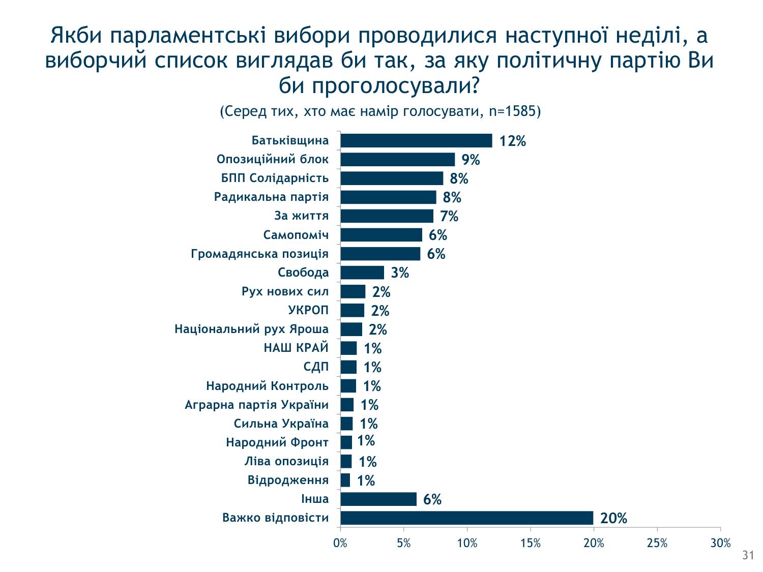 Среди тех, кто определился с выбором и намерен принять участие в голосовании, 12% готовы отдать свой голос за партию "Батькивщина", 9% - за партию "Оппозиционный блок", 8% - за "Блок Петра Порошенко – Солидарность", 8% - за "Радикальную партию", 7% - за партию "За життя", 6% - за партию "Самопомич", 6% - за партию "Гражданская позиция".
