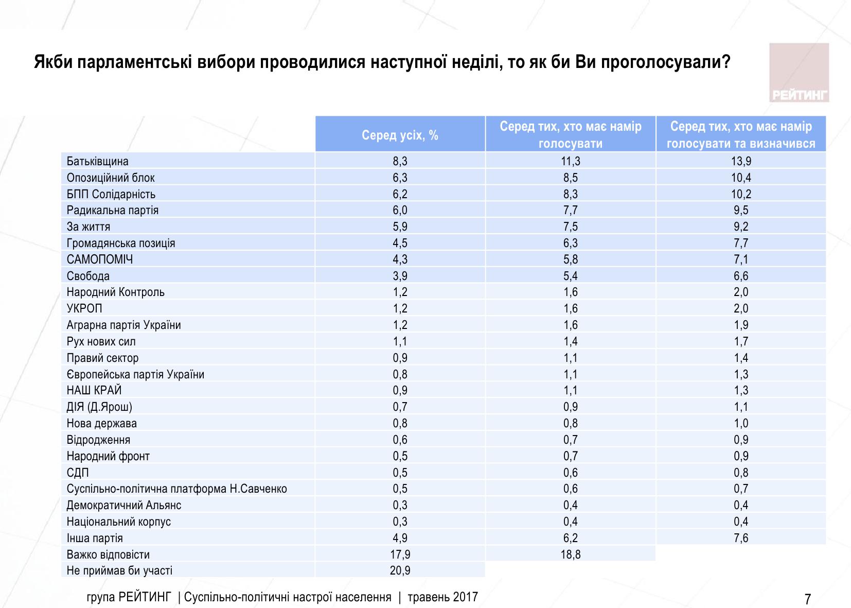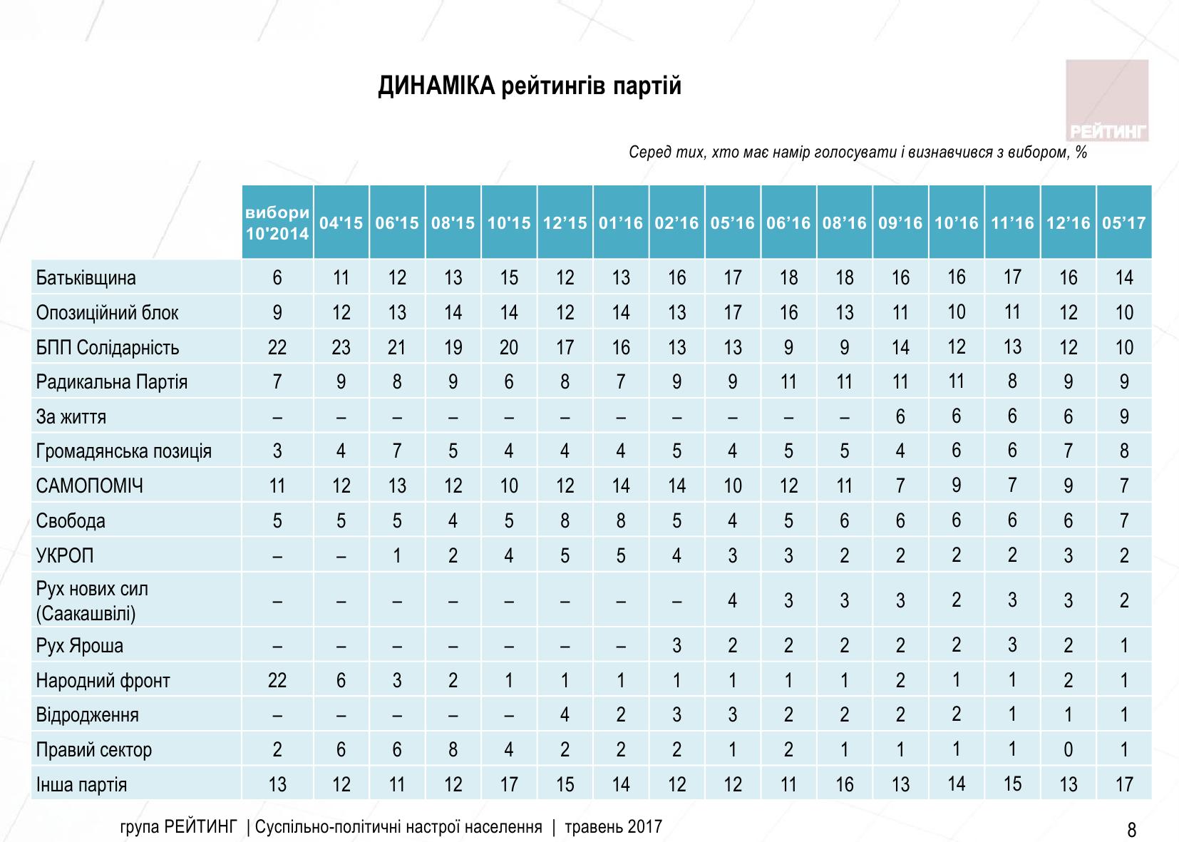 Среди тех, кто намерен принять участие в голосовании и определился с выбором, готовы отдать свои голоса за партию "Батькивщина" 13,9% респондентов, за партию "Оппозиционный блок" - 10,4%, за партию "БПП Солидарность" - 10,2%, за "Радикальную партию" - 9,5%, за партию "За жизнь" - 9,2%, за партию "Гражданская позиция" - 7,7% опрошенных, за "Самопомич" - 7,1%, за партию "Свобода" - 6,6%.