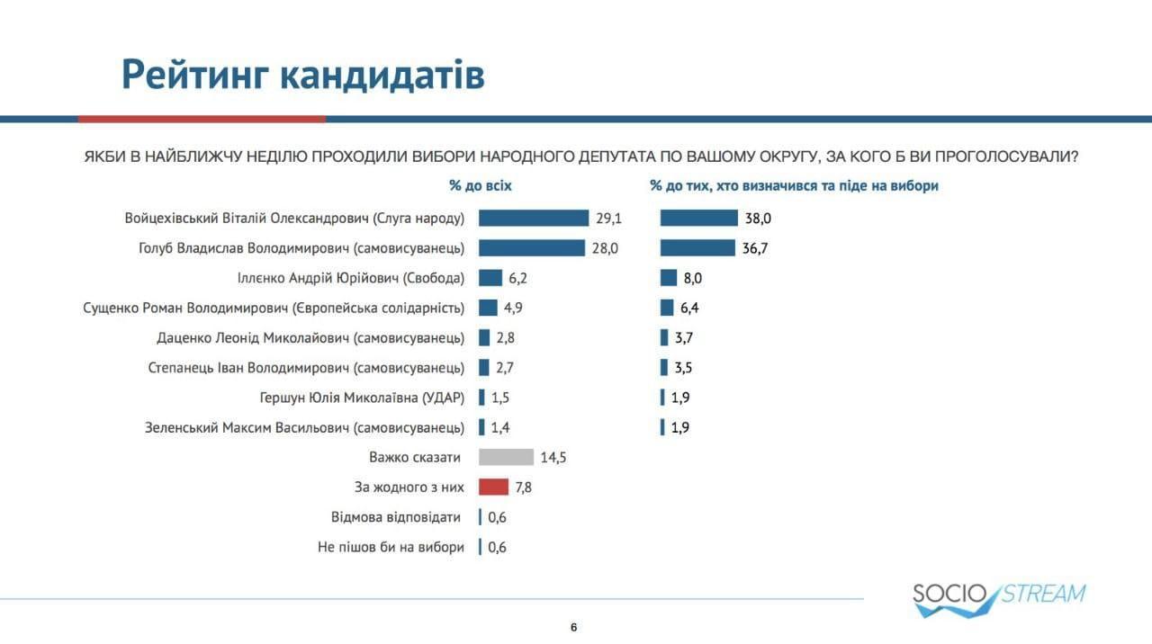 Согласно полученным результатам, в округе есть два явных фаворита - кандидат от «Слуги народа» Виталий Войцеховский, который имеет поддержку 38% избирателей, и самовыдвиженец Владислав Голуб с 36,7%. Другие кандидаты существенно отстают от лидеров гонки.