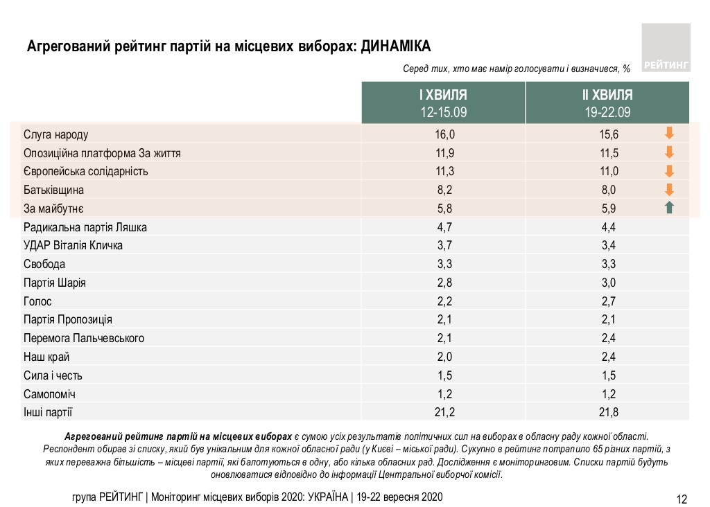 Кроме того, за «Радикальную партию Олега Ляшко» готовы проголосовать 4,4% респондентов, за УДАР Виталия Кличко - 3,4%, за ВО «Свобода» - за партию Шария - 3% граждан. При этом партию «Голос» поддерживают 2,7% опрошенных, партию «Наш край» и «Победа Пальчевского» - по 2,4%, партию «ПроПозиция» - 2,1%, «Силу и честь» - 1,5%, партию «Самопомощь» - 1,2%. Суммарный рейтинг других партий, участвующих в местных выборах и включенных в список для исследования, - 21,8%.