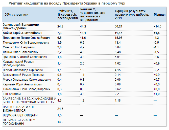 При этом, 13,1% определившихся респондентов заявили, что проголосовали были за лидера партии "Оппозиционная платформа – За жизнь" Юрия Бойко, 11,6% за лидера партии "Европейская солидарность", пятого президента Петра Порошенко, 6,9% - за лидера Всеукраинского объединения "Батькивщина" Юлию Тимошенко.