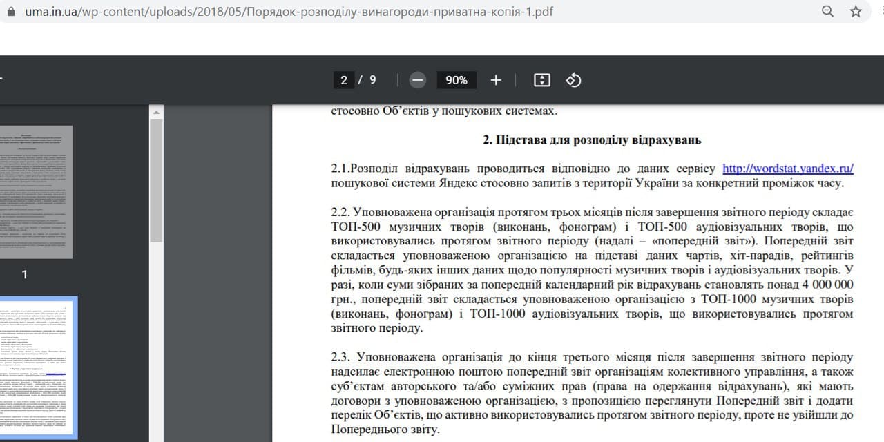 Не удалось услышать ответы от Павла Калиниченко на вопрос от Дмитрия Гузия, эксперта по авторскому праву, в отношении имеющегося на официальном сайте УМА текста "правил распределения" полученных от импортеров отчислений, основанный на положениях уже недействительной предыдущей редакции законодательства, то есть фактически на уже отсутствующие нормы, которые не соответствует требованиям Закона 2415. При этом распределение отчислений, согласно Положению ОКУ «Украинский музыкальный альянс» проводится в соответствии с данным сервиса поисковой системы Яндекс. Стоит отметить, что Яндекс с 2017 года заблокирован на территории Украины решением СНБО.