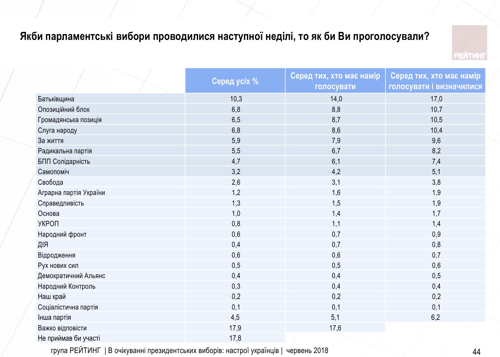 Лидером рейтинга остается за партия "Батькивщина", за которую готовы проголосовать 10,3% граждан Украины.
