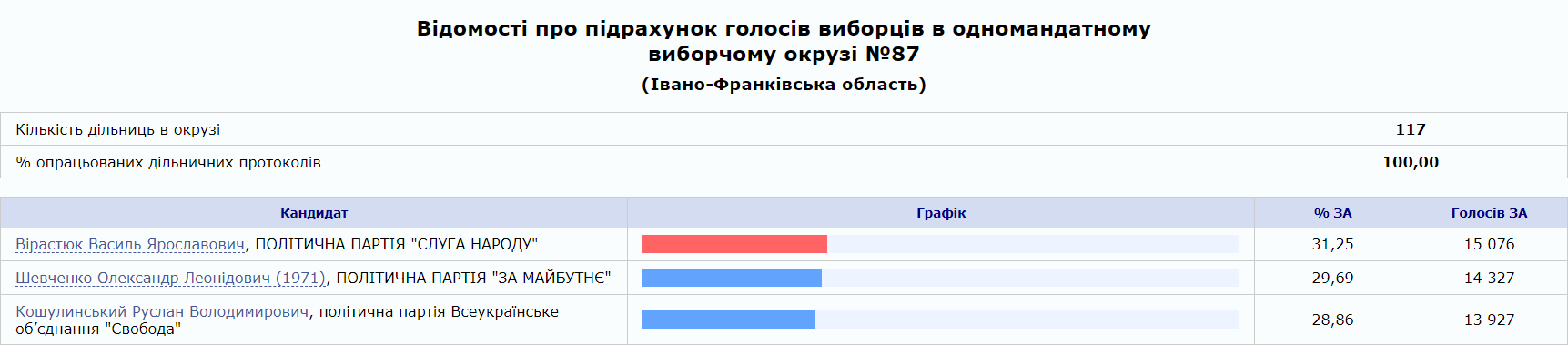 Вирастюк получил 31,25%, выдвиженец «За майбутнє», формальный владелец горнолыжного курорта «Буковель» Александр Шевченко - 29,69%. Разрыв между кандидатами - 750 голосов. На третьем месте «свободовец» Руслан Кошулинский (28,86%).