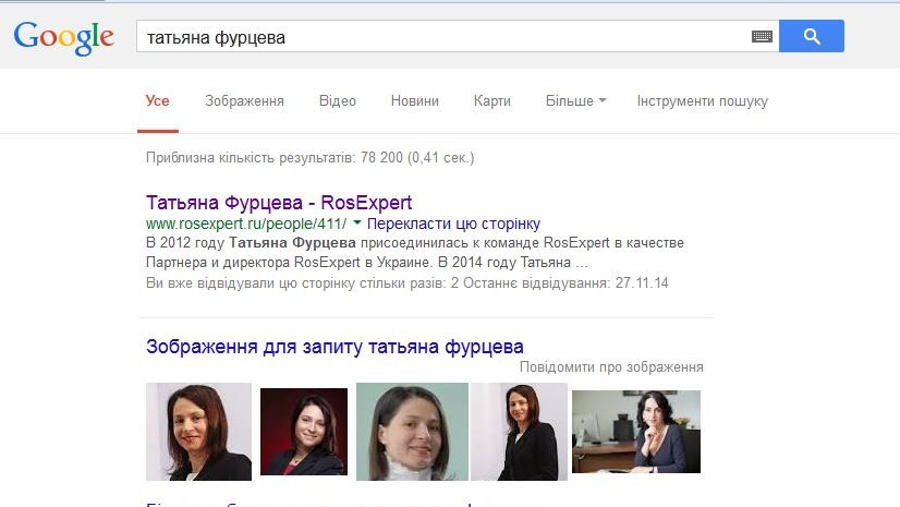 Ссылка на зачищенную страницу пока еще на первом месте в поисковике Google при поиске "Татьяна Фурцева". Те, кто удалял информацию, явно спешили – во "второстепенных" закладках сайта на утро субботы еще оставался контент (интервью и новости) о Т.Фурцевой как старшем партнере российской компании и генеральном директоре "Росэксперта" в Украине.