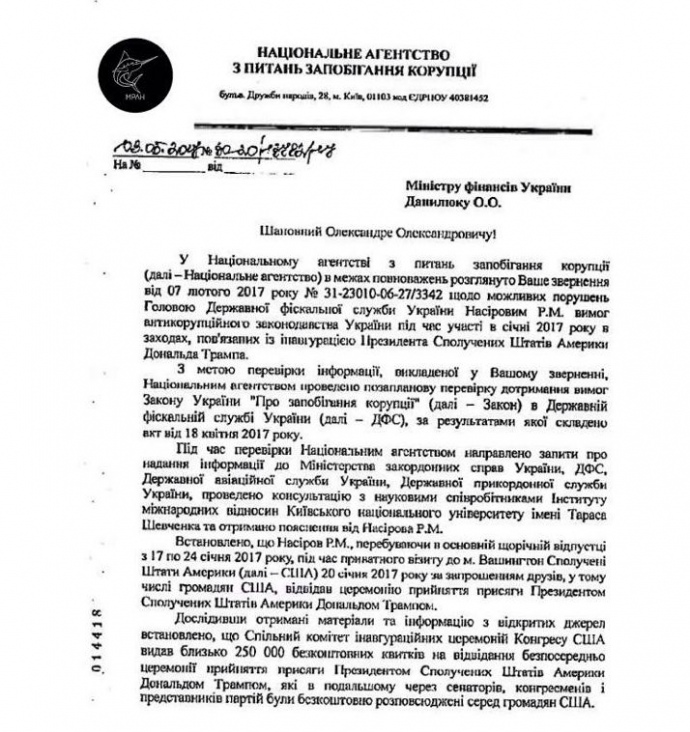 В ответе Нацагентства по вопросам предотвращения коррупции также говорится о том, что Насиров мог посетить инаугурацию президента США по одному из бесплатных приглашений на нее, распространяемых американскими политиками.