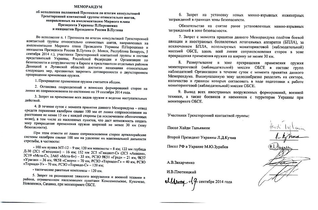 На сайте ОБСЕ появился оригинал "Меморандума о выполнении положений протокола по итогам консультаций Трехсторонней контактной группы относительно шагов, направленных на имплементацию Мирного плана президента Украины Петра Порошенко". Документ обнародован в субботу, спустя сутки после подписания в пятницу, 19 сентября, в Минске.