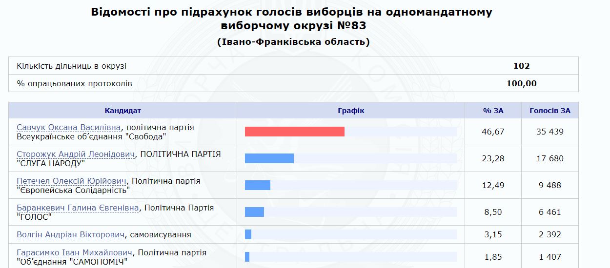 В одномандатном избирательном округе №83 в Ивано-Франковской области победила кандидат от ВО "Свобода" Оксана Савчук. Об этом свидетельствуют данные на сайте ЦИК.