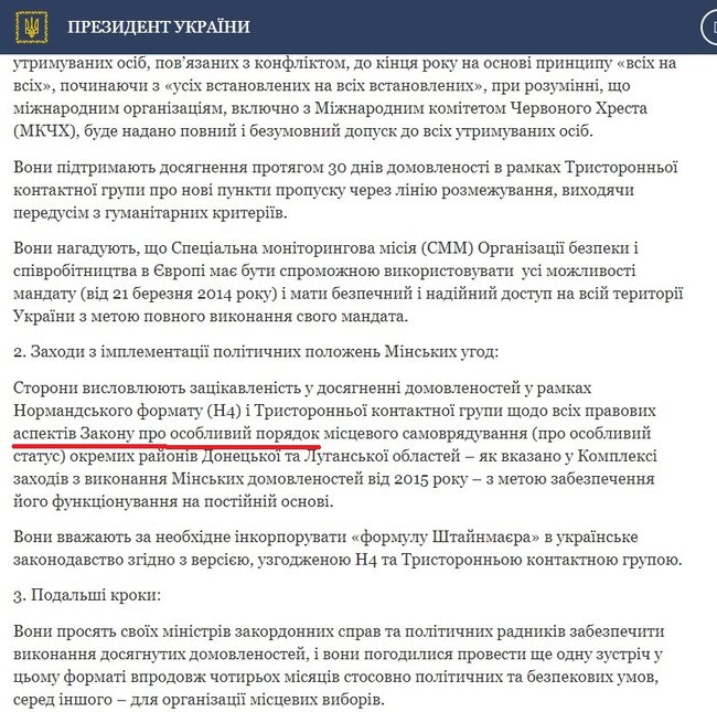 Однако позже упоминание закона об особом статусе ОРДЛО из документа убрали. И та же сама часть текста стала выглядеть так: "стороны выражают заинтересованность в достижении договоренностей в рамках Нормандского формата (Н4) и Трехсторонней контактной группы по всем правовым аспектам особого порядка местного самоуправления (особого статуса) отдельных районов Донецкой и Луганской областей".