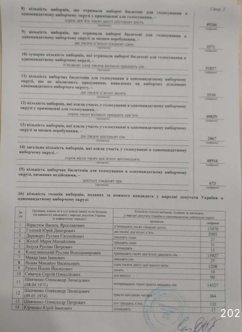 Фотокопию протокола вечером обнародовала Гражданская сеть «ОПОРА». Согласно документу, голоса за кандидатов распределены следующим образом: