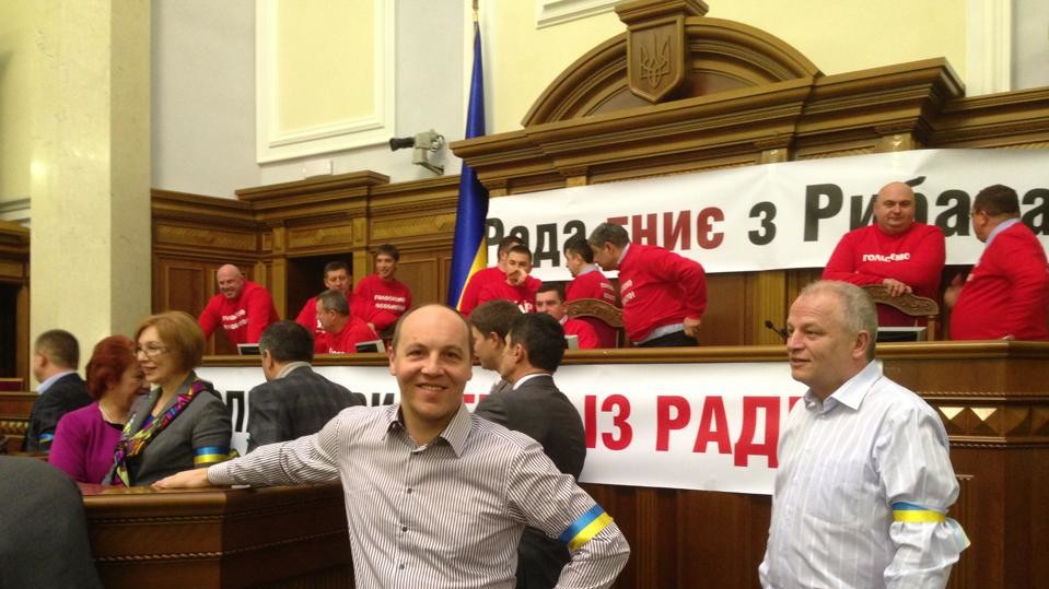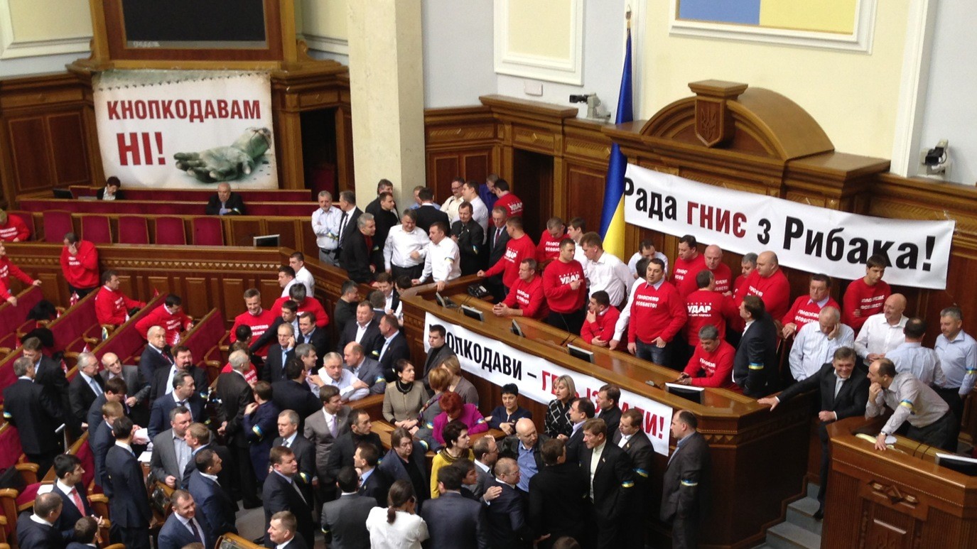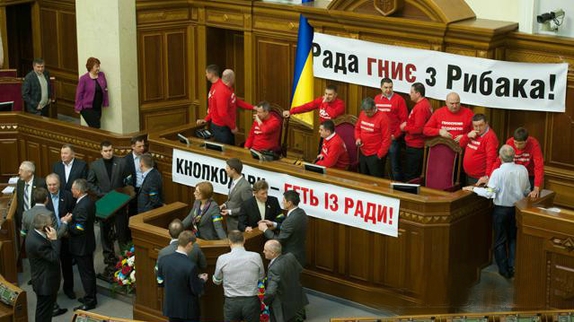 В зале развешены плакаты. "Депутат, ходи на работу, голосуй лично", "Кнопкодавам – нет". Над президиумом размещена растяжка: "Рада гниет с Рыбака". На столах президиума закреплен баннер с надписью: "Кнопкодавы, вон из Рады!".