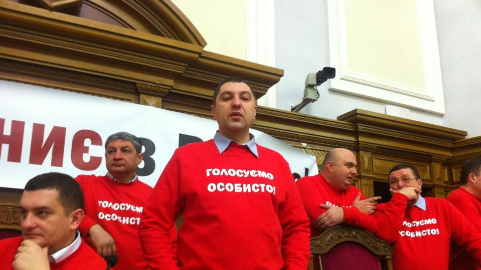 Отметим, что часть оппозиционных депутатов пришли в парламент в красных свитерах с надписью "Голосуємо особисто!".